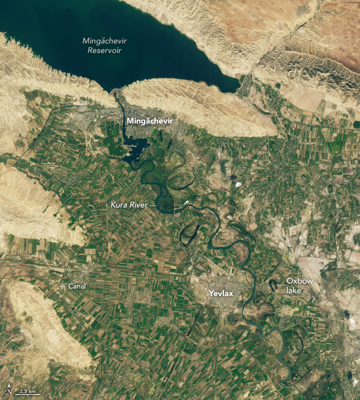 While natural processes often form meanders and oxbow lakes, human activity has also transformed the landscape. In addition to dams, a network of canals runs through the scene on both sides of the river, conveying water to farmland and towns. This irrigation system makes it easier to grow a variety of crops, including cotton, barley, millet, wheat, sunflowers, fruits, and vegetables, in the region’s cold, semi-arid climate.