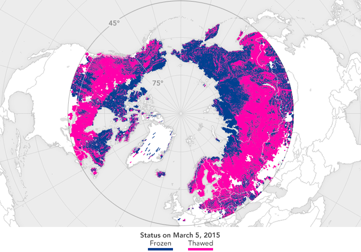 The transition between frozen and thawed land is something researchers have observed for more than 30 years with satellites. The Nimbus-7 Pathfinder, the Defense Meteorological Satellite Program (DMSP) satellites, and Aqua all have carried passive microwave radiometers. They detect the microwave energy coming from the Earth’s surface, which will have different characteristics depending on whether the soil is frozen or thawed. When surface water and soil moisture is locked away as ice, this frozen landscape looks like a desert to a microwave sensor. Thawed landscapes look comparatively wet, so this large contrast is the basis for something called a freeze-thaw measurement.