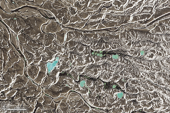 The second image shows a chain of colorful lakes on Victoria Island, in the Northwest Territories of Canada. While much of the region is still frozen in June, the snow and ice are in various stages of melting. Early season melt water carries sediment from glacial erosion into the lakes, giving them a uniform green color.