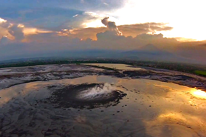 Over the years, flows of boiling mud from Lusi have displaced more than 40,000 people, destroyed 15 villages, and caused nearly $3 billion in damage. It has become one of the most dramatic and damaging eruptions of its type. Some villages have been buried by layers of mud 40 meters (130 feet) thick. The mud, which has a consistency similar to porridge, pours constantly from Lusi’s main vent. Every thirty minutes or so, surges in the flow send plumes of water vapor, carbon dioxide, and methane shooting tens of meters into the air.