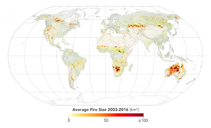 In the map of fire size above, other areas with large fires include grasslands and steppe areas in Africa, Kazakhstan, and western Russia. Fires that burned through boreal forests in North America and Siberia also tend to be large.