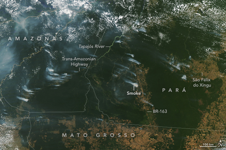 The natural-color satellite image below shows smoke from some of the deforestation fires clustered along major roads, such as the Trans-Amazonian Highway and BR-163. Deforestation fires also proliferated through the region known as “Terra do Meio,” or “land in the middle,” a frontier area in Pará sandwiched between indigenous territories and the Xingu and Iriri rivers. In all of these places, farmers and land speculators have cleared significant amounts of rainforest in recent years in order to expand cattle ranching and large-scale agriculture.