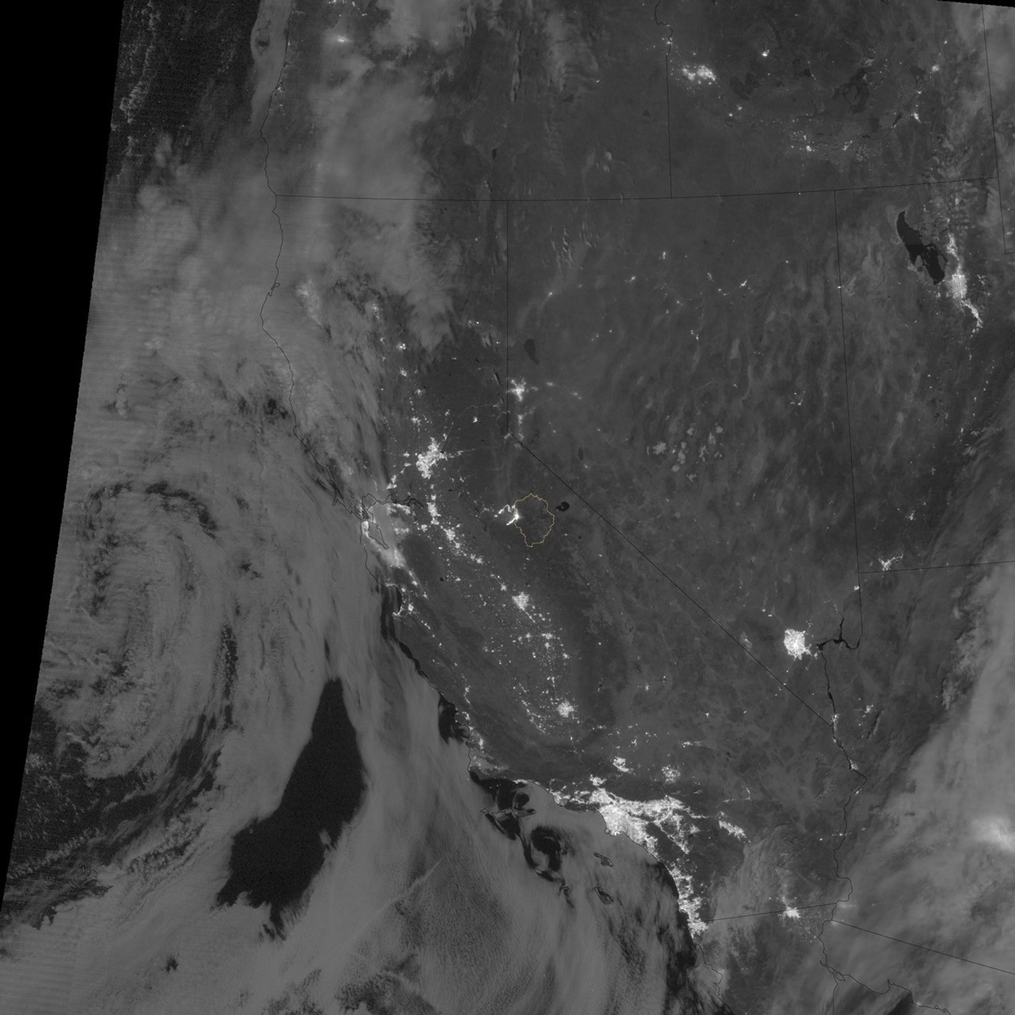 The Visible Infrared Imaging Radiometer Suite (VIIRS) on the Suomi NPP satellite tracked the growth of the fire between August 23–26. The VIIRS day-night band is extremely sensitive to low light, making it possible to see the fire front from space at night. The brightest, most intense parts of the fire glow white, exceeding the brightness of the lights of Reno, Nevada, to the north. Pale gray smoke streams away from the fire, generally to the north.