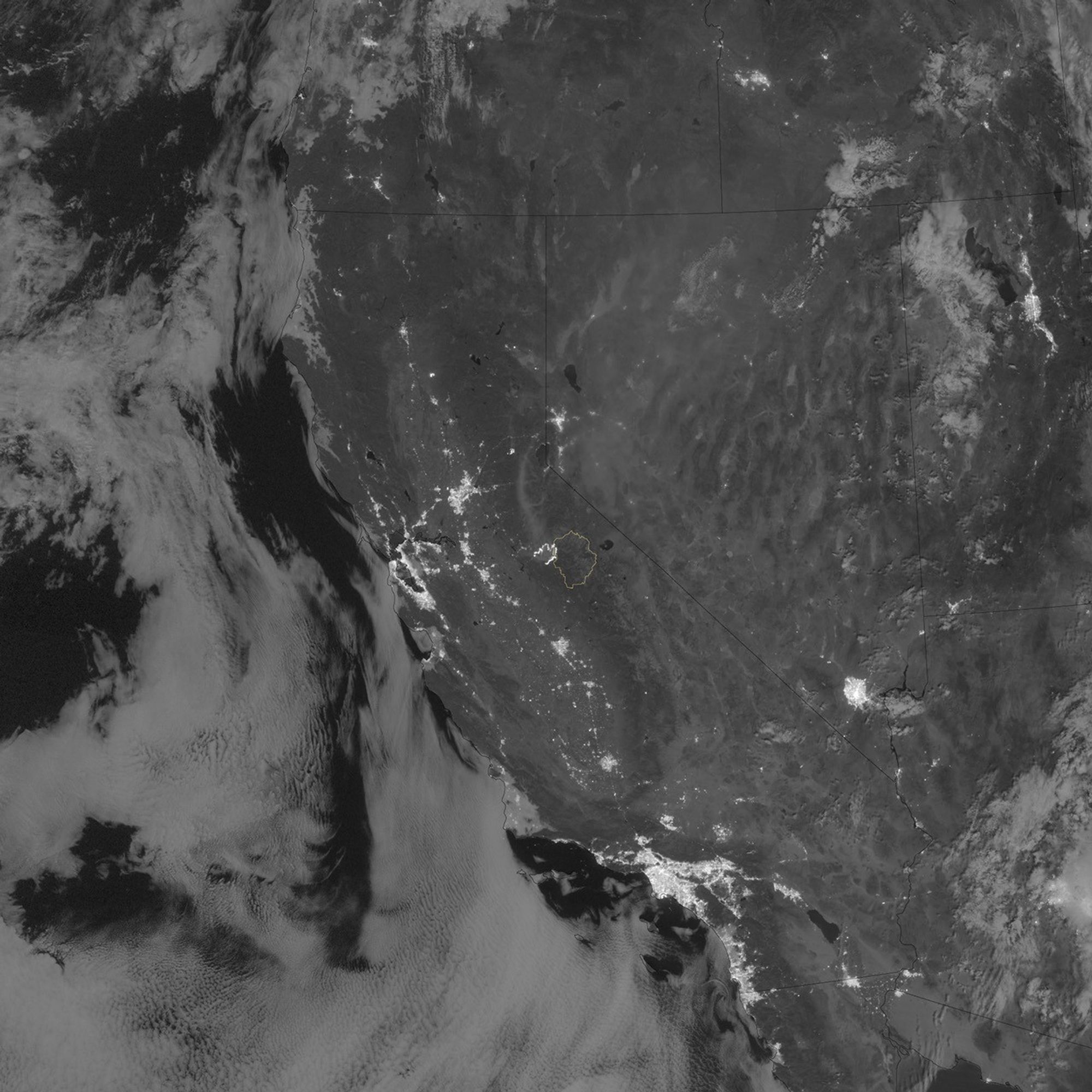 The Visible Infrared Imaging Radiometer Suite (VIIRS) on the Suomi NPP satellite tracked the growth of the fire between August 23–26. The VIIRS day-night band is extremely sensitive to low light, making it possible to see the fire front from space at night. The brightest, most intense parts of the fire glow white, exceeding the brightness of the lights of Reno, Nevada, to the north. Pale gray smoke streams away from the fire, generally to the north.