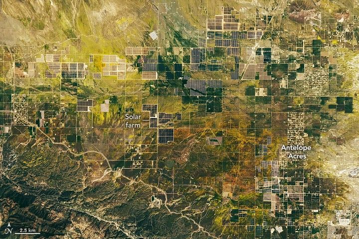 On April 15, 2023, the Operational Land Imager-2 (OLI-2) on Landsat 9 captured another vibrant view of the bloom (right). By this time, the golden-orange poppies had faded in places, while canary yellow flowers in the upper left of the image pop out. The yellow flowers are surrounded by panels from a solar farm.