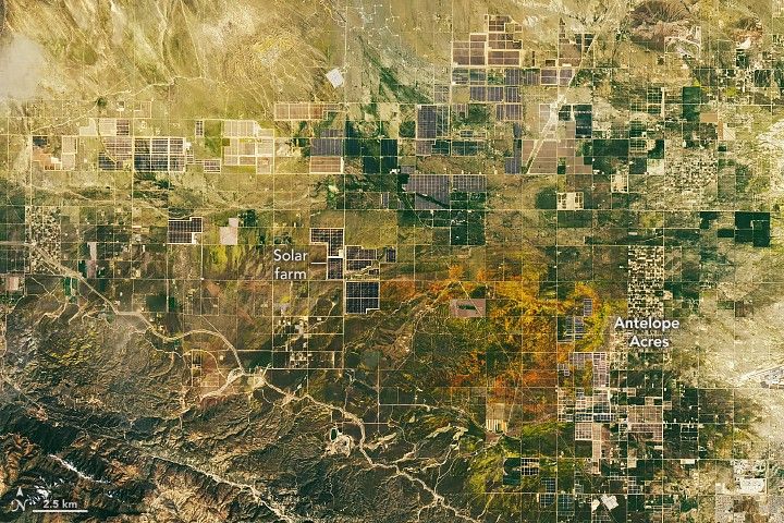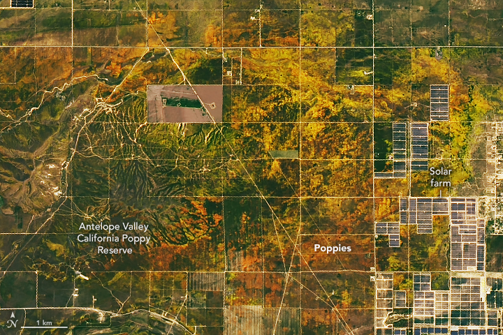 On April 15, 2023, the Operational Land Imager-2 (OLI-2) on Landsat 9 captured another vibrant view of the bloom (right). By this time, the golden-orange poppies had faded in places, while canary yellow flowers in the upper left of the image pop out. The yellow flowers are surrounded by panels from a solar farm.