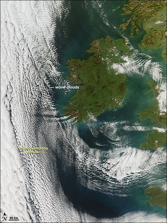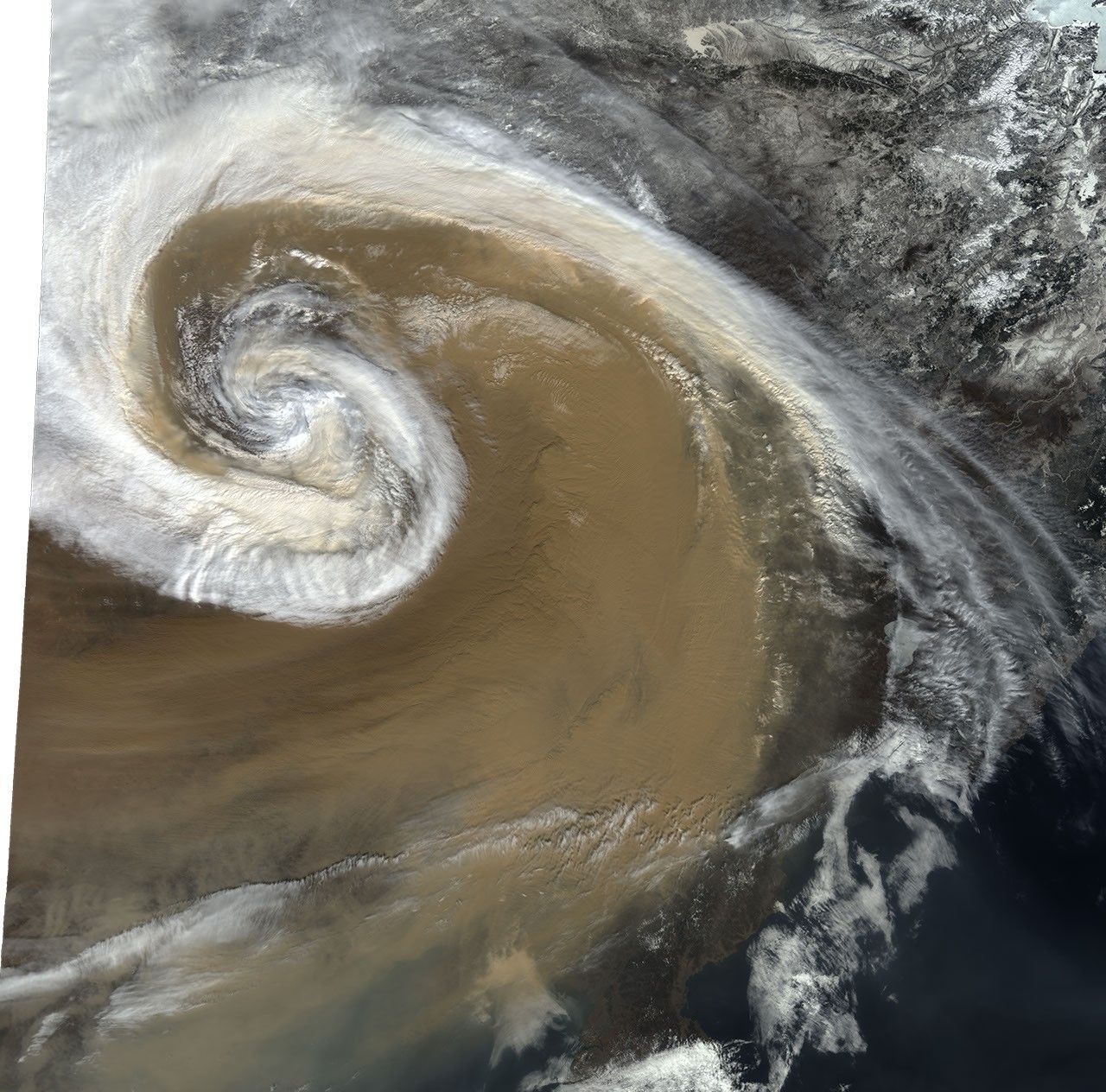 In early April of 2001 a strong temperate cyclone spun counter-clockwise over China, pushing a wall of dust as it moved. The deep tan dust is not only thick enough to completely hide much of the land surface below, but it almost forms its own topography, with ridges of dust rising up below the clouds, visible in the bottom image.