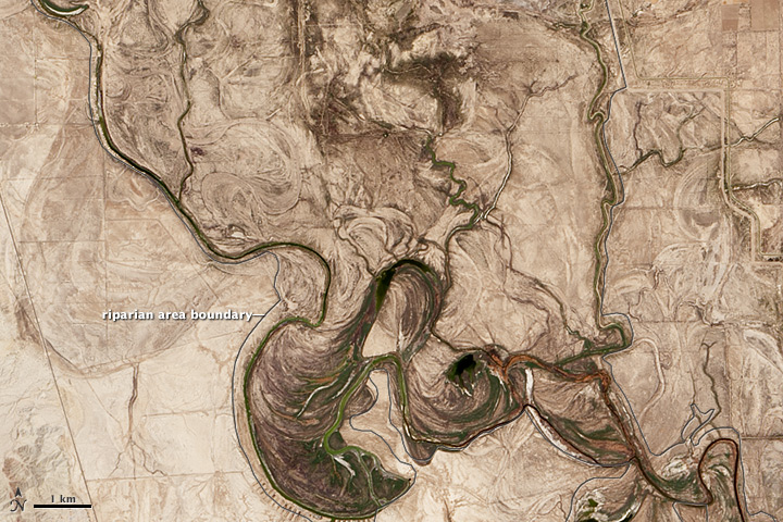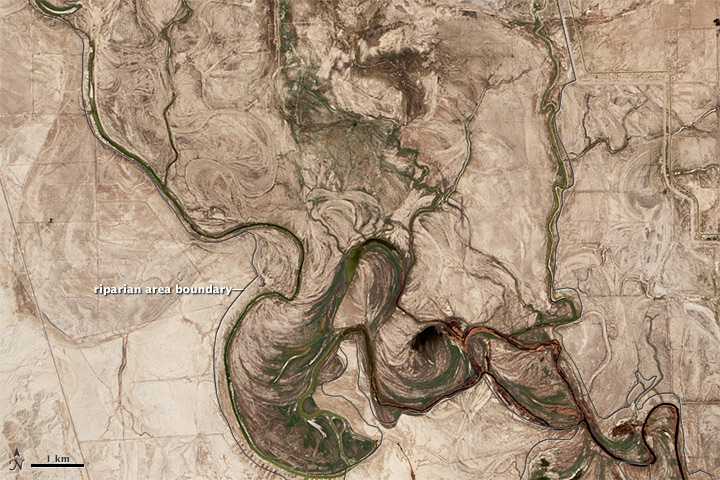 The spring 2014 “pulse flow” brought back some of the green, as shown in the images on this page. The map above, built with data from the Operational Land Imager on Landsat 8, shows changes in the Normalized Difference Vegetation Index, or NDVI, along part of the lower Colorado River in Mexico. Green depicts areas where vegetation was healthier and greener in August 2014—after the pulse flow—than in August 2013. Brown shows areas with less or less healthy vegetation.