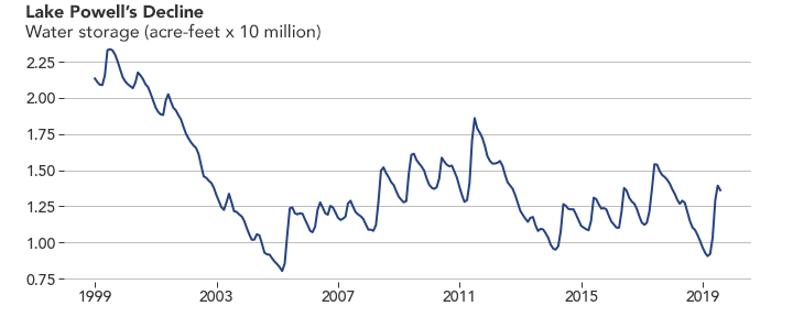 Heavy snowfall in the Rocky Mountains in the winter and spring of 2019 provided a much-needed pulse of meltwater into Lake Powell, the second largest reservoir (by maximum water capacity) in the United States. Still, the effects of long-term droughts and rising air temperatures, combined with increasing demands for water in the American Southwest, mean the lake is still nowhere near its highs from the 1980s and 90s.