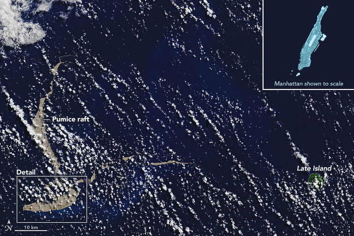 On August 13, 2019, the Operational Land Imager on Landsat 8 acquired natural-color imagery of a vast pumice raft floating in the tropical Pacific Ocean near Late Island in the Kingdom of Tonga. NASA’s Terra satellite detected the mass of floating rock on August 9; the discolored water around the pumice suggests that the submarine volcano lies somewhere below. By August 13, the raft had drifted southwest. As of August 22, the raft had moved north again and was a bit more dispersed, but still visible.
