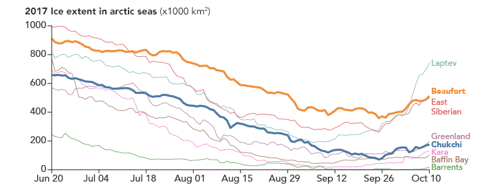 This year, ice in the Chukchi and Beaufort and seas reached their minimum extents toward the end of September, later than the Arctic as a whole. The graph above shows the ice in these two seas was still declining while other regions had started freezing. The melting persisted the longest in the Beaufort Sea, which finally started to refreeze after reaching a minimum on September 27. Data for the graph come from the NSIDC Multi-sensor Analyzed Sea Ice Extent (MASIE) product, which is based on operational sea ice analyses produced by the U.S. National Ice Center.