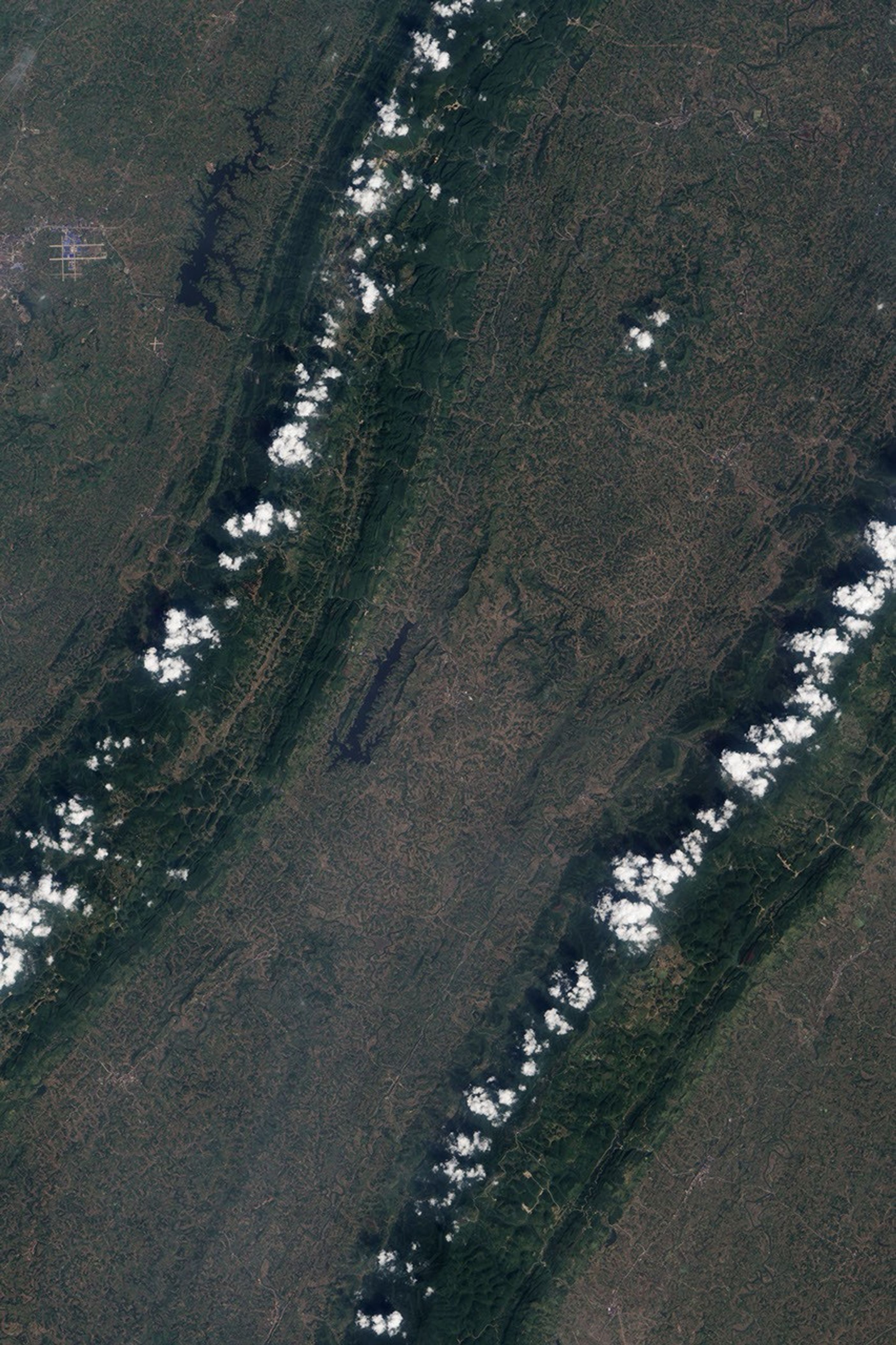 In addition to the ridges, ALI captured another interesting feature as it passed over: long lines of clouds directly above the ridges. It’s not a coincidence that the clouds lined up so well, as they are orographic clouds—a type that forms when the shape of the landscape (in this case, hills) forces moist air up to altitudes where the water vapor cools and condenses. Orographic clouds can take many shapes and forms, but they move slowly and often appear stationary because their formation is so dependent on topography.