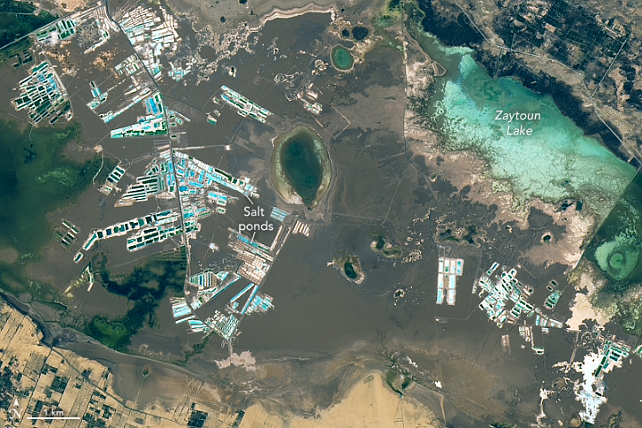 Cultivated land, primarily used to grow olives and date palms, is visible in the image above as the dark areas abutting the lakes. The extraction of water through wells for irrigation has caused the surface area of the Siwa lakes to fluctuate significantly.