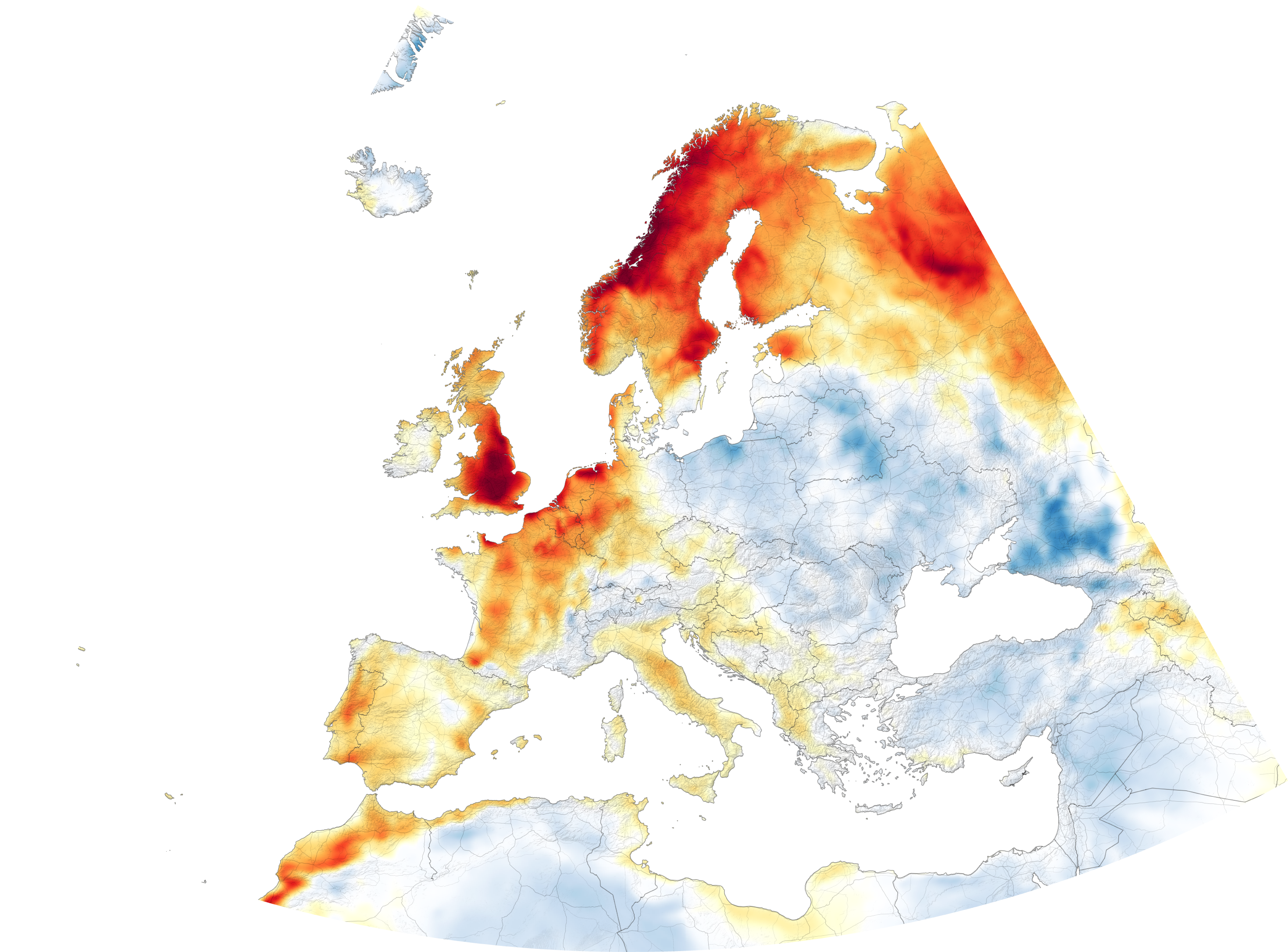 These record-breaking temperatures come just one month after another record-breaking heatwave. However, July temperatures soared much higher than Juneâabout 15°C higher in some regions. The map below, created with data from the GEOS model, shows the temperature difference between June 26 and July 25, 2019. Satellites also show the ground becoming browner from June to July.