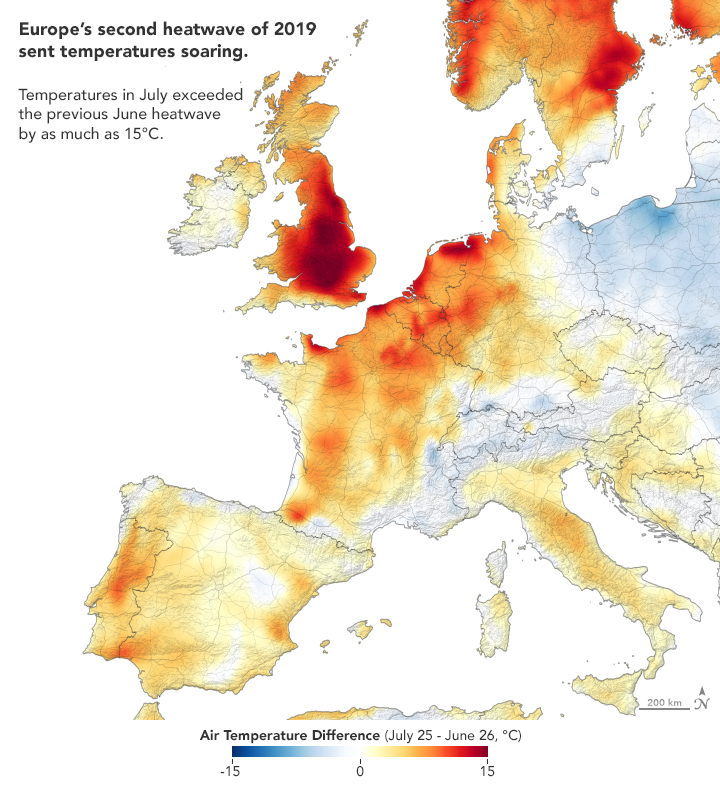 These record-breaking temperatures come just one month after another record-breaking heatwave. However, July temperatures soared much higher than Juneâabout 15°C higher in some regions. The map below, created with data from the GEOS model, shows the temperature difference between June 26 and July 25, 2019. Satellites also show the ground becoming browner from June to July.