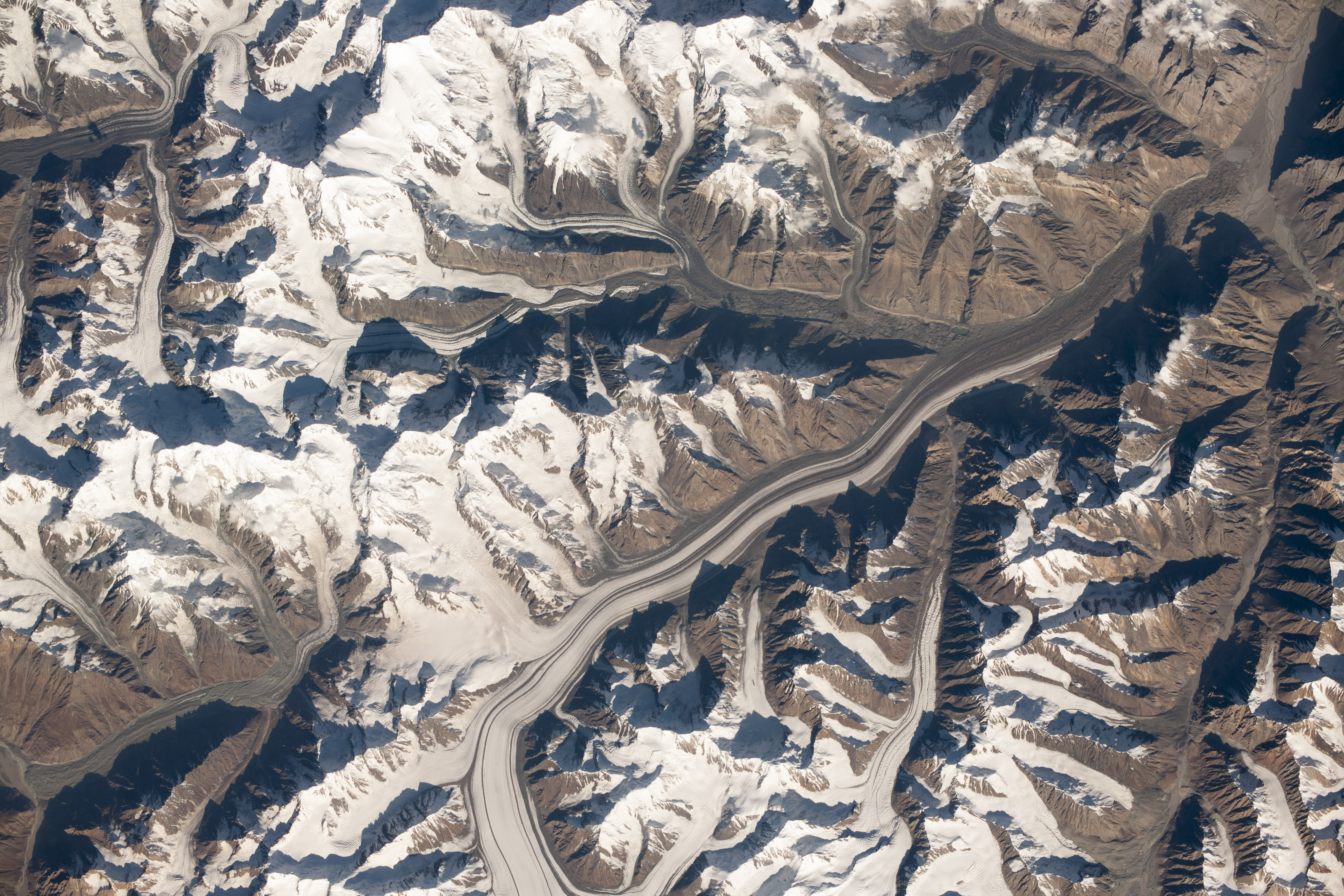 Bivachny Glacier, a surging glacier in Tajikistan, contains a textbook example of looped medial moraines. Notice in this photograph taken from the International Space Station how the fairly straight moraines of Bivachny begin to warp as they encounter ice from MGU glacier. The snaking pattern downstream of the junction of the two glaciers offers a record of the ongoing push-and-pull taking place. When Bivachny is not surging, MGU glacier pushes forward, partly blocking off Bivachny’s flow. As ice backs up and pressure builds, Bivachny eventually surges forward and pushes MGU’s dam back. When Bivachny’s surge slows down, MGU creeps back and the cycle starts anew. Based on field work and studies of satellite imagery, scientists believe that Bivachny has gone through at least three distinct surges in the second half of the 20th Century.