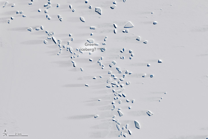 Green icebergs aside, Lieser has both scientific and operational purposes for studying satellite images of fast ice. For example, he uses the images to help ecologists survey and locate seabirds. In this image, an equally small but less colorful spot (brown) on the ice is due to an accumulation of penguin guano.