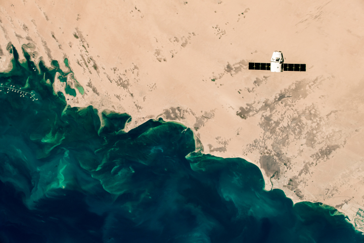 The second image shows the capsule passing over Manifa, Saudi Arabia. Manifa is home to one of the world’s biggest oil fields, a part of which is visible in the upper left of the photo. These manmade islands—each the size of 10 soccer fields—serve as “onshore” drill sites above offshore oil fields. The emerald waters also house more than 85 species of fish and 50 species of coral.