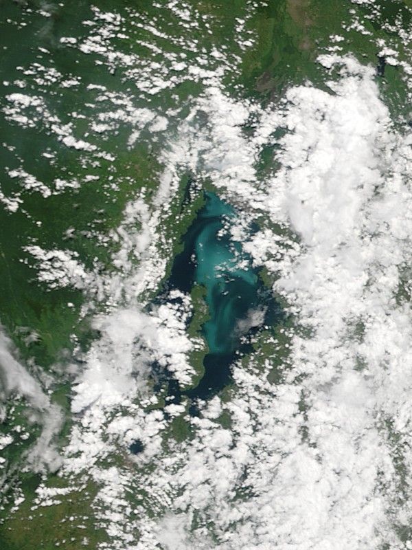 Augusta Umutoni, head of the LKMP, noted that another research team detected some seismic and volcanic activity in the region in April, which initially heightened concern about the lake. But observations by Umutoni’s team showed that this month’s color change was actually much less ominous. Lake Kivu is going through a “whiting event” similar to those that occasionally happen on the Great Lakes of North America and several large lake (such as Geneva) in Europe. The Moderate Resolution Imaging Spectroradiometer (MODIS) instruments on NASA’s Terra and Aqua satellites peeked through the clouds to acquire three natural-color images of the lake whiting event on April 10, 18, and 20, 2016.