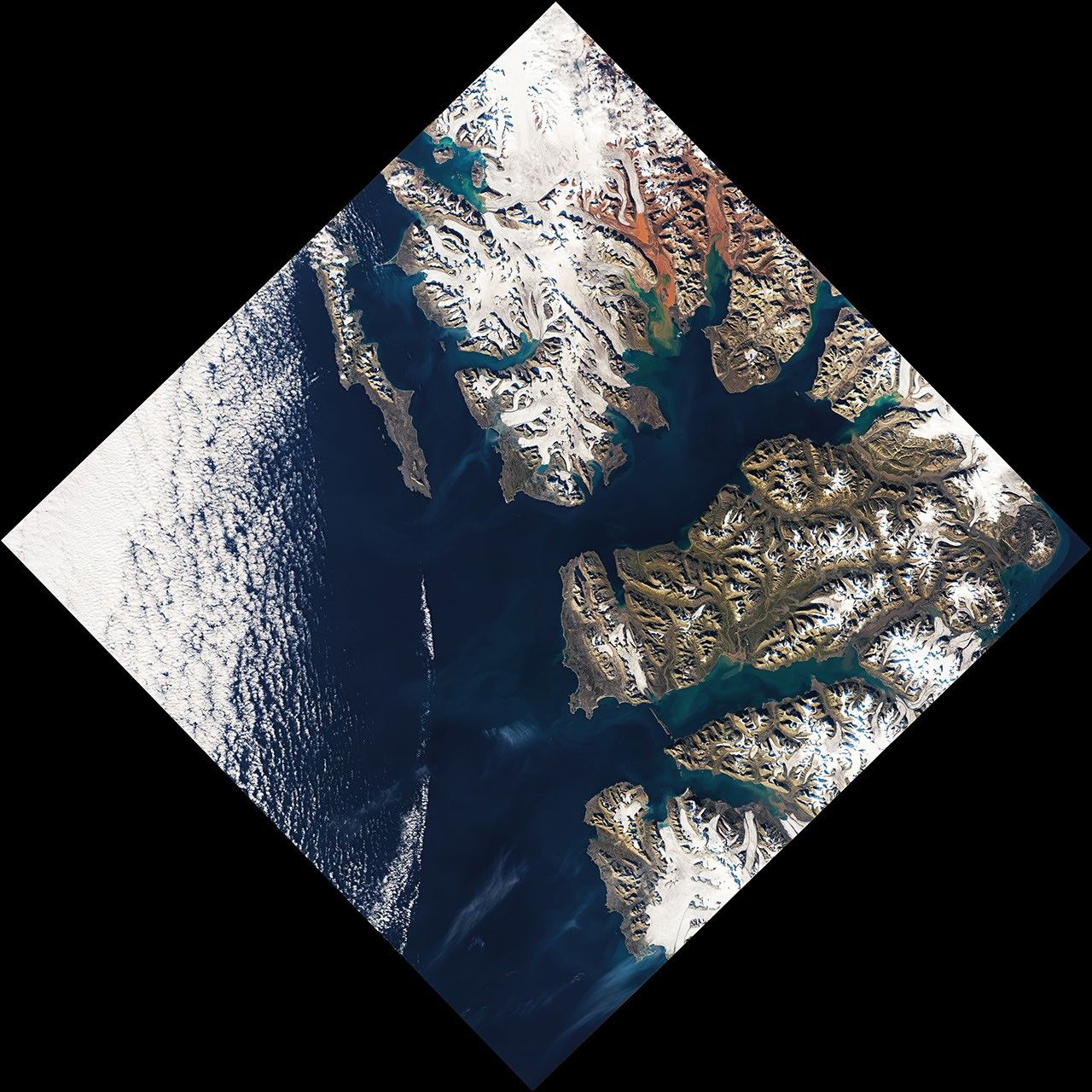 Among the more striking geologic attractions, at least when viewed from above, are glaciers on the archipelago’s northwestern island of Spitsbergen. The ice there seems to “bleed” meltwater that is an intense shade of red. The Operational Land Imager (OLI) on Landsat 8 acquired this natural-color image of red water pooling in a shallow meltwater lake near the terminus of Holmström glacier. The image was captured on August 23, 2020, shortly after an unusual heatwave brought record-breaking temperatures to Svalbard. The image below shows a wider view. Note that the image has been rotated to combat relief inversion, an optical illusion that can make valleys look like mountains.