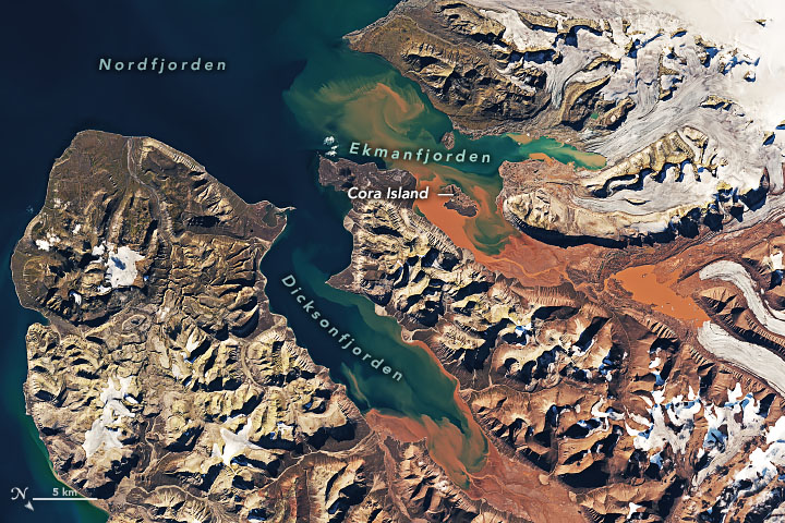 Among the more striking geologic attractions, at least when viewed from above, are glaciers on the archipelago’s northwestern island of Spitsbergen. The ice there seems to “bleed” meltwater that is an intense shade of red. The Operational Land Imager (OLI) on Landsat 8 acquired this natural-color image of red water pooling in a shallow meltwater lake near the terminus of Holmström glacier. The image was captured on August 23, 2020, shortly after an unusual heatwave brought record-breaking temperatures to Svalbard. The image below shows a wider view. Note that the image has been rotated to combat relief inversion, an optical illusion that can make valleys look like mountains.