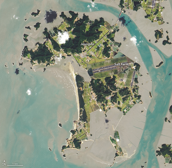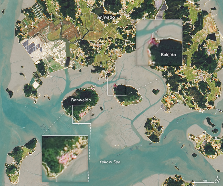 The images on this page show portions of Sinan County, or Shinan-gun, on October 15, 2020. The images were acquired by the Operational Land Imager (OLI) on the Landsat 8 satellite.