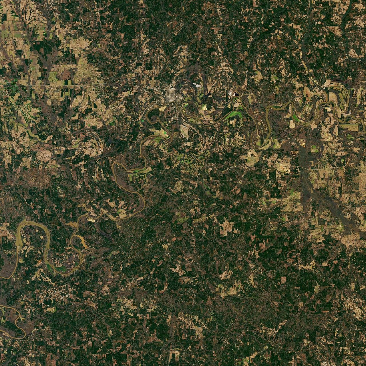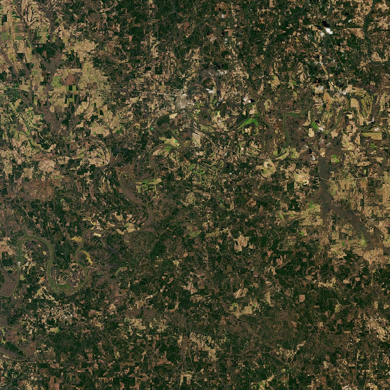 The track across the left-middle of the image is from the EF2 event that passed through Selma. The track toward the top-right is the beginning of a stronger and longer tornado. This deadly EF3 event tracked northeast for almost 77 miles (124 kilometers) with wind speeds that peaked at 150 miles per hour. It snapped trees, flipped cars, and destroyed numerous homes.