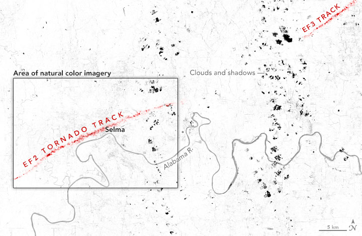 The track across the left-middle of the image is from the EF2 event that passed through Selma. The track toward the top-right is the beginning of a stronger and longer tornado. This deadly EF3 event tracked northeast for almost 77 miles (124 kilometers) with wind speeds that peaked at 150 miles per hour. It snapped trees, flipped cars, and destroyed numerous homes.