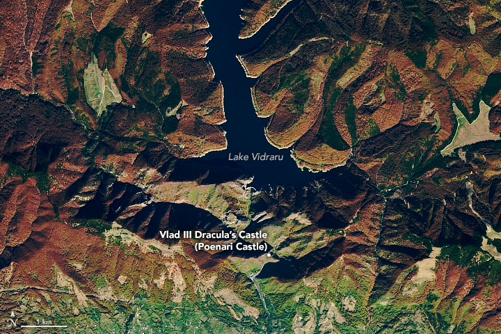 The natural-color image above shows a more detailed view of the area around Poenari Castle and Lake Vidraru (a reservoir) as observed on October 24, 2019, by the Operational Land Imager (OLI) on the Landsat 8 satellite. Note the fall colors on the hillsides, as well as the foreboding shadows cast by the mountains. A drone flyover video gives an even closer perspective on the rugged landscape.