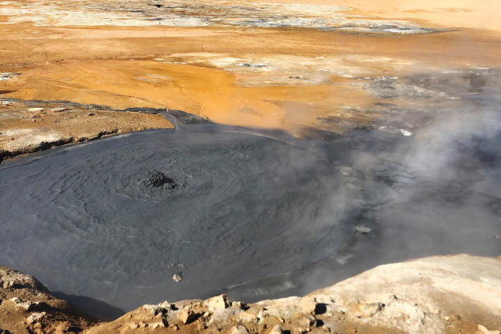 North of Hverfjall lies the Námafjall geothermal area, an otherworldly place pockmarked with pools of bubbling mud (mudpots) and fumaroles hissing with noxious fumes. Little vegetation grows in this geothermal area because of the soil’s sustained exposure to volcanic gases and acidic waters. The photograph below shows a mudpot in Námafjall.