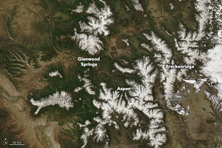 On June 9, 2019, Colorado’s Natural Resources Conservation Service measured a snow water equivalent of 7.5 inches (19 centimeters) for the state of Colorado. For June, that is quite high—8 times higher than usual for the state and up to 20 times higher for certain river basins. In most years, the snow water equivalent drops well below 2 inches (5 centimeters) in June.