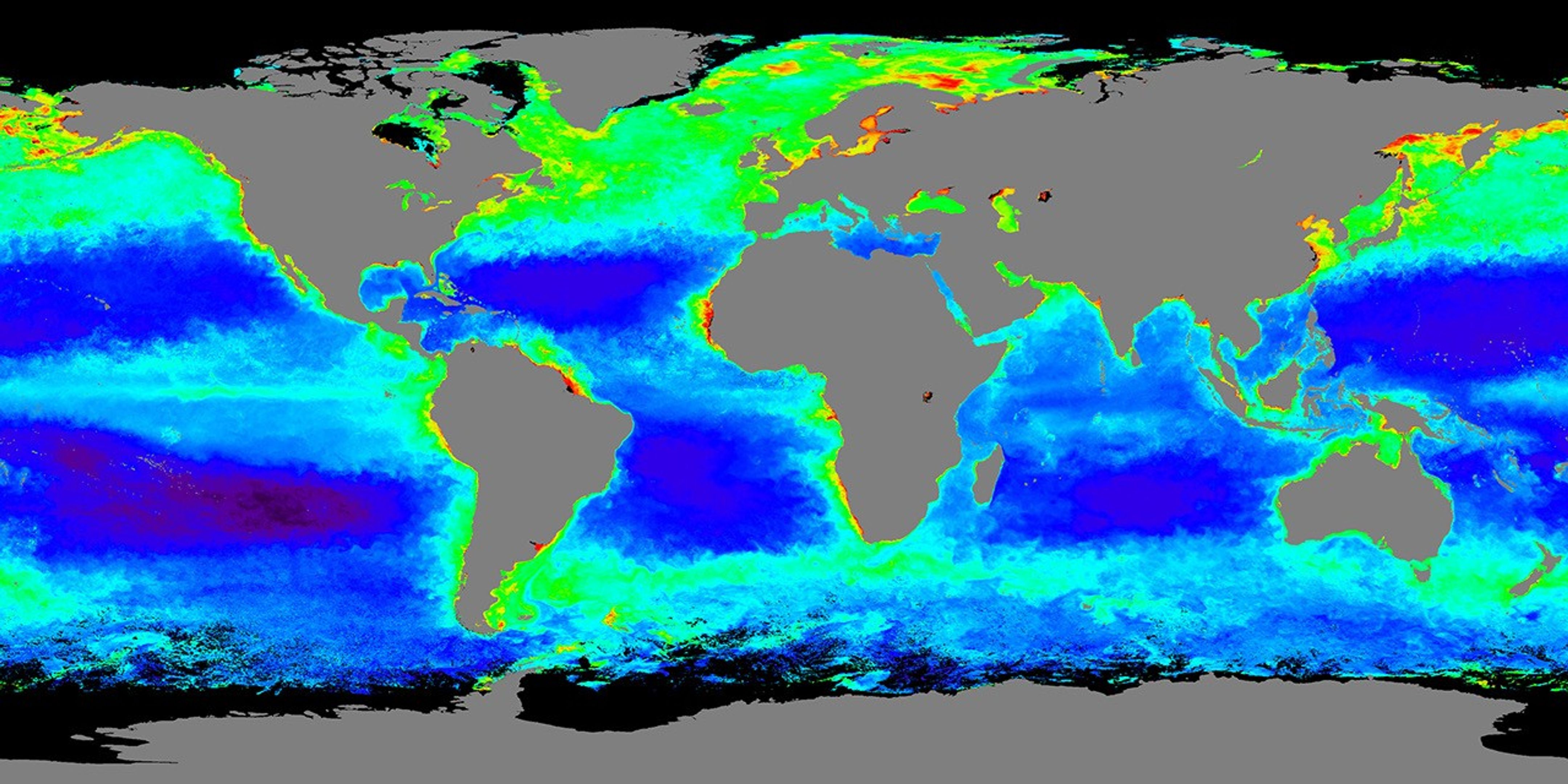 Bright greens, yellows, and reds indicate that the northern oceans were alive with plant life in the spring of 2006. This image shows chlorophyll concentrations as measured by the Sea-viewing Wide Field-of-view Sensor (SeaWiFS) satellite and the Moderate Resolution Imaging Spectroradiometer (MODIS) on NASA’s Aqua satellite between March 21 and June 20, 2006. Observations of global chlorophyll patterns tell scientists where ocean surface plants are growing, which is an indicator of where marine ecosystems are thriving. These surface plants, called phytoplankton, are the base of the food chain, and regions that support large phytoplankton blooms also tend to support a diverse marine population. Such global maps also give scientists an idea of how much carbon the plants are soaking up, which is important in understanding the global carbon budget.