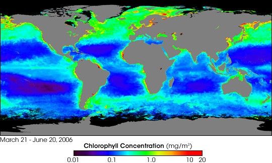 Bright greens, yellows, and reds indicate that the northern oceans were alive with plant life in the spring of 2006. This image shows chlorophyll concentrations as measured by the Sea-viewing Wide Field-of-view Sensor (SeaWiFS) satellite and the Moderate Resolution Imaging Spectroradiometer (MODIS) on NASA’s Aqua satellite between March 21 and June 20, 2006. Observations of global chlorophyll patterns tell scientists where ocean surface plants are growing, which is an indicator of where marine ecosystems are thriving. These surface plants, called phytoplankton, are the base of the food chain, and regions that support large phytoplankton blooms also tend to support a diverse marine population. Such global maps also give scientists an idea of how much carbon the plants are soaking up, which is important in understanding the global carbon budget.