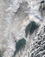 On December 31, 2010, Kizimen continued releasing plumes of ash and steam. The U.S. Air Force Weather Agency reported ongoing activity as the Moderate Resolution Imaging Spectroradiometer (MODIS) on NASA’s Aqua satellite showed a plume from the volcano blowing southward over the Kamchatka Peninsula.