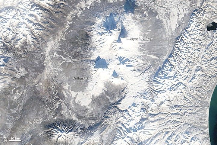 Tolbachik Volcano on Russia’s Kamchatka Peninsula showed signs of unrest in late November 2012. The Moderate Resolution Imaging Spectroradiometer (MODIS) on NASA’s Terra satellite detected unusually high surface temperatures and an apparent ash plume on November 29 (top image). For comparison, the bottom image shows the volcano before any obvious activity occurred.