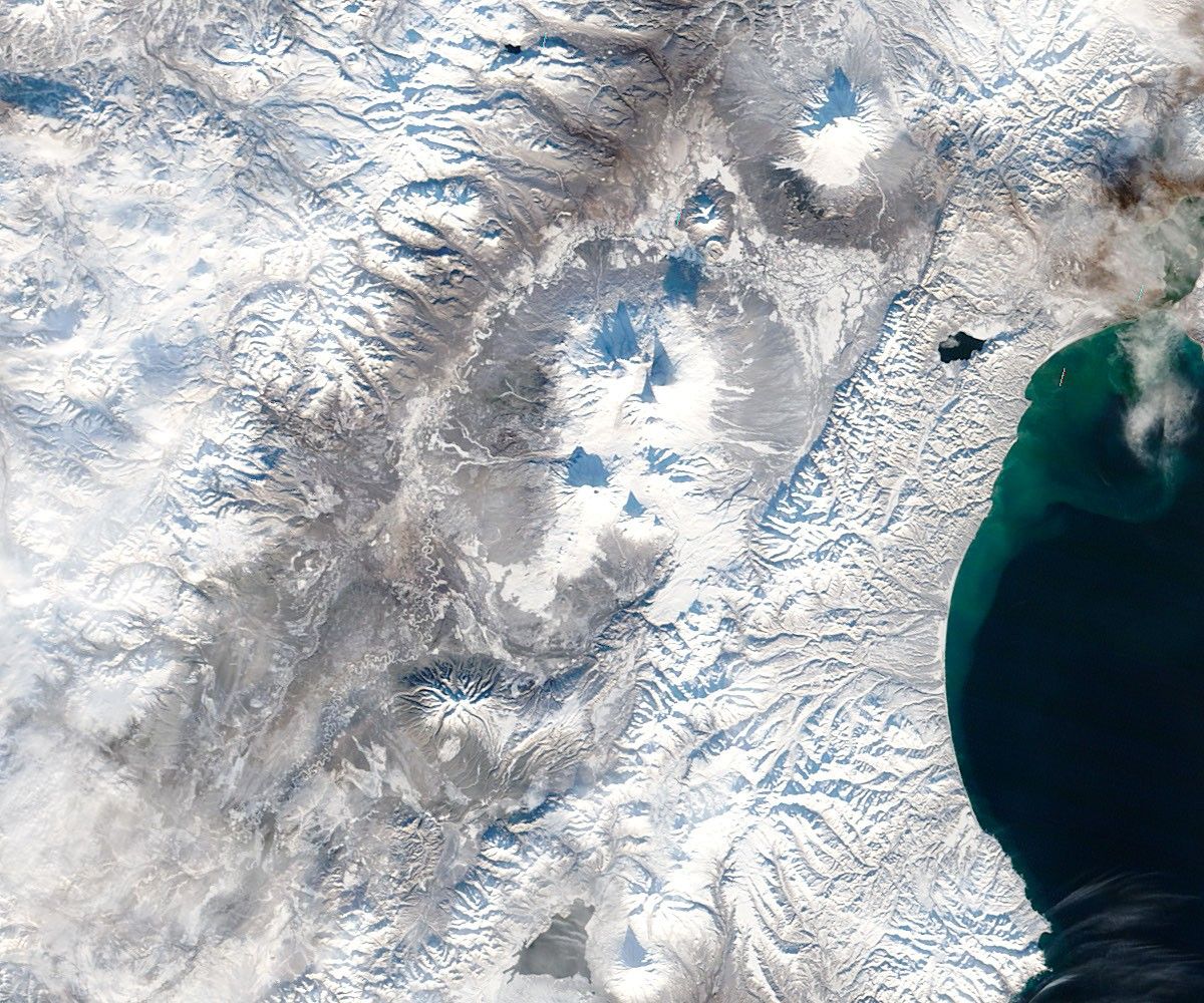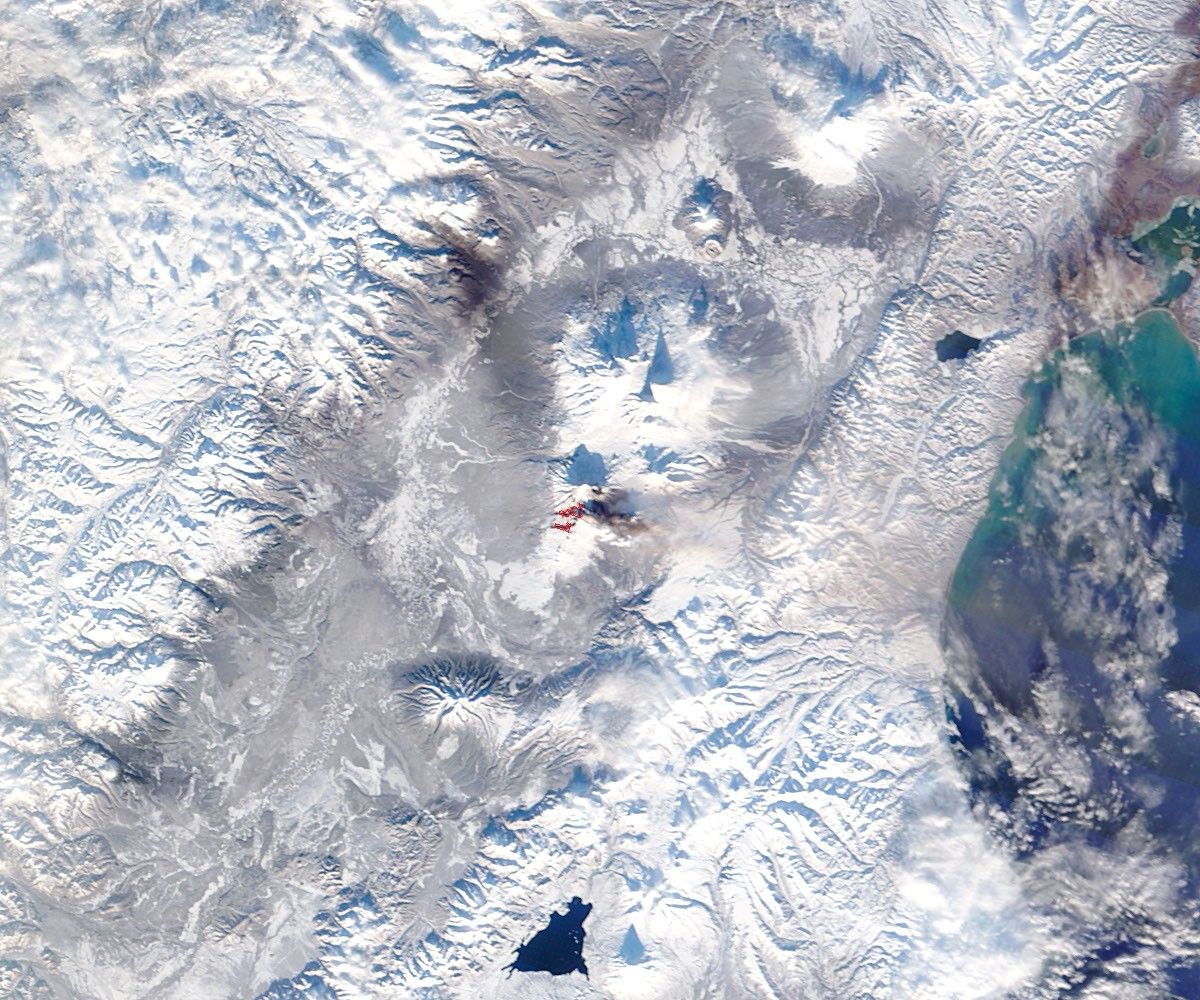 Tolbachik Volcano on Russia’s Kamchatka Peninsula showed signs of unrest in late November 2012. The Moderate Resolution Imaging Spectroradiometer (MODIS) on NASA’s Terra satellite detected unusually high surface temperatures and an apparent ash plume on November 29 (top image). For comparison, the bottom image shows the volcano before any obvious activity occurred.