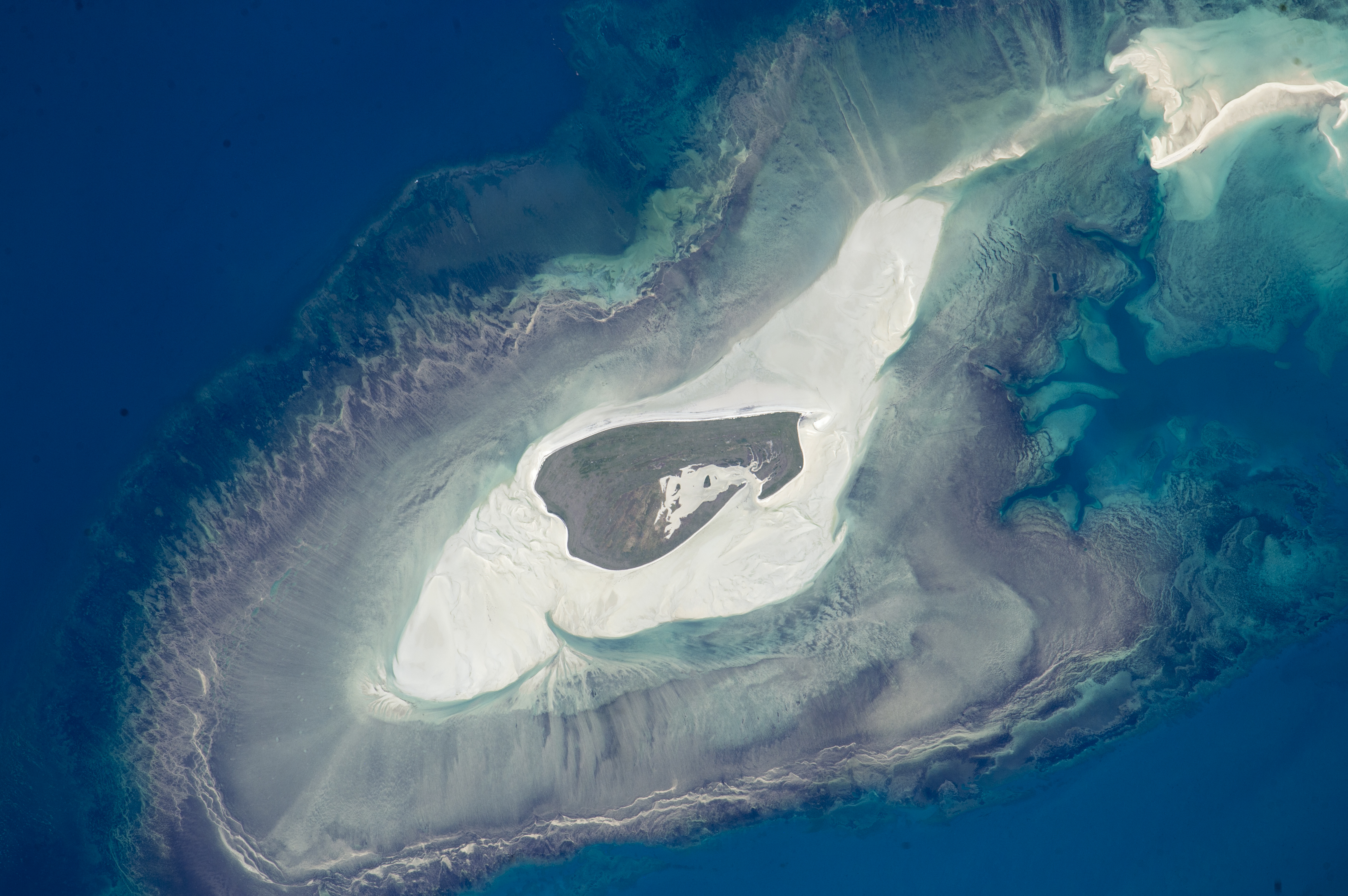 An astronaut aboard the International Space Station took this photograph of Adele Island, off of Australia’s north coast. The island is only 2.9 kilometers (2 miles) long, but the entire tidal zone—with concentric and extensive sandbanks—is 24.5 kilometers (15.2 miles) long.