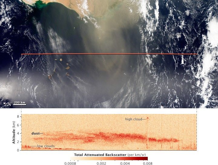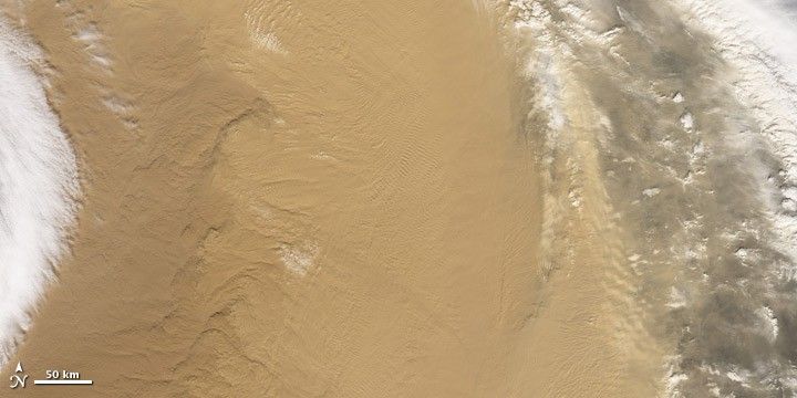 Nature generates broad swaths of particles—detectable by satellites—over both water and land. The strong winds of the “roaring forties” latitudes, for example, create a heavy band of airborne salt north of Antarctica. A thinner and more evenly dispersed veil of aerosols—primarily salt from whitecaps and sulfates from microalgae—usually covers most of the world’s oceans. Over land, massive plumes of dust blow above deserts.