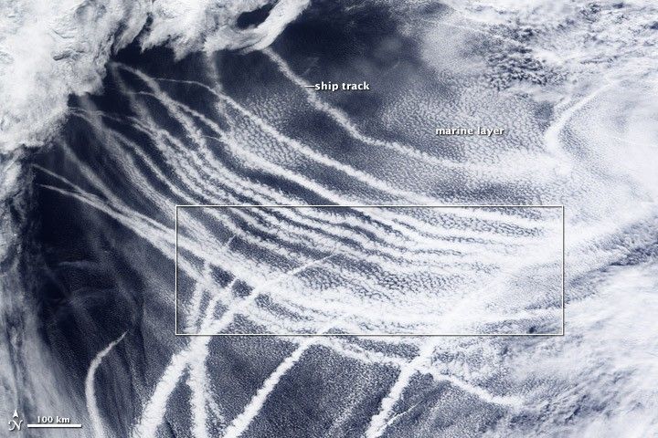 This impact of aerosols is clearly visible in ship tracks, bright streaks in marine clouds that look like airplane contrails. In the absence of ships, sea salt particles and the natural sulfates produced by phytoplankton seed most marine clouds. However, the exhaust from ship smokestacks make trails of sulfates and other aerosols that form long, bright clouds.