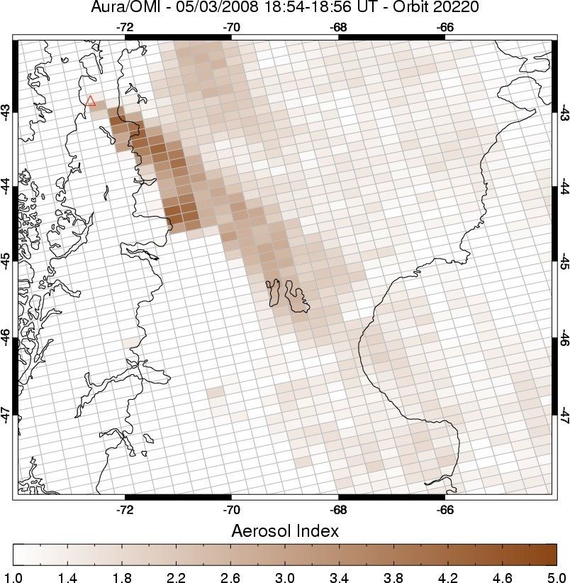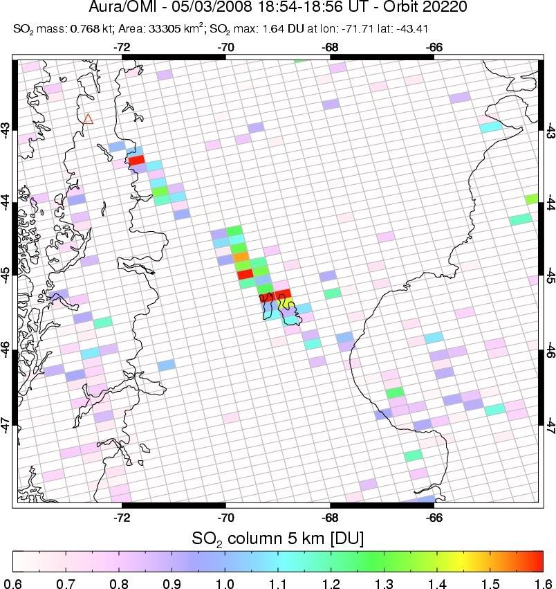 The images compare total aerosols, tiny particles of both ash and sulfates, top, to the part of the plume made up of sulfur dioxide alone, below. These observations were made by the Ozone Monitoring Instrument (OMI) on NASA’s Aura satellite on May 3, 2008. (For a photo-like image from May 3, see Chaiten Volcano Erupts.) The top image illustrates that the volcanic plume was thickest near the volcano and thinned as it blew southeast over the Atlantic Ocean. The lower image shows the sulfur dioxide component of the plume in Dobson Units. If you flattened a five-kilometer-tall column of the atmosphere and measured the amount of sulfur dioxide in the column, one Dobson Unit of the gas would be 0.01 millimeters thick and would contain 0.0285 grams of sulfur dioxide per square meter. This image shows that Chaiten pumped out relatively little sulfur dioxide in its eruption. Most of the aerosols in the plume were ash.