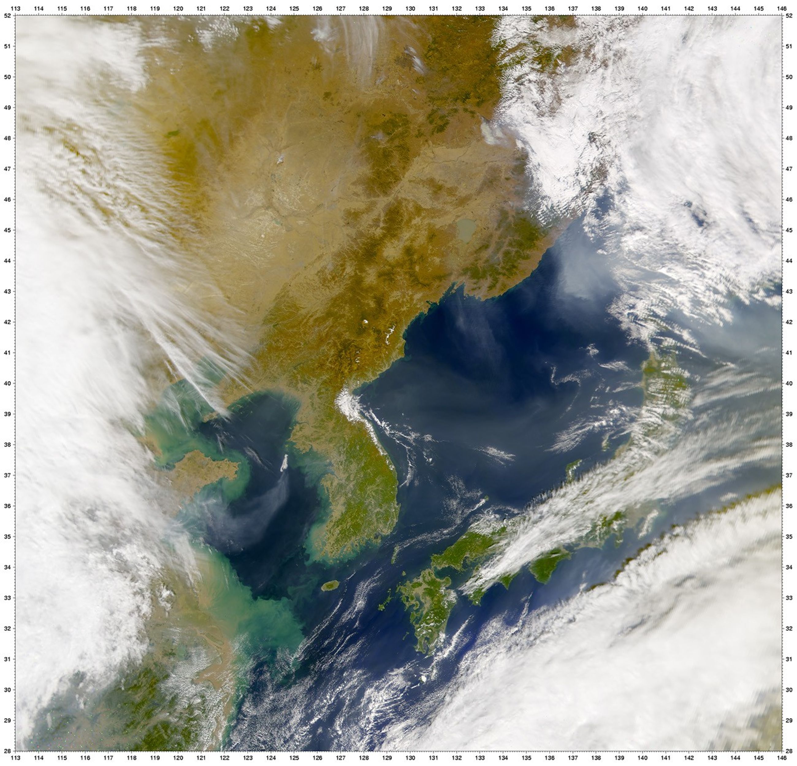 At lower left, the Yangtze River plume in the East China Sea is also very prominent. Sediment suspended in the ocean water is quite brown near the shore, but becomes much greener as it diffuses into the water. The increasing greenness of the river plume is probably an indication of enhanced phytoplankton growth driven by the nutrients in the river runoff.