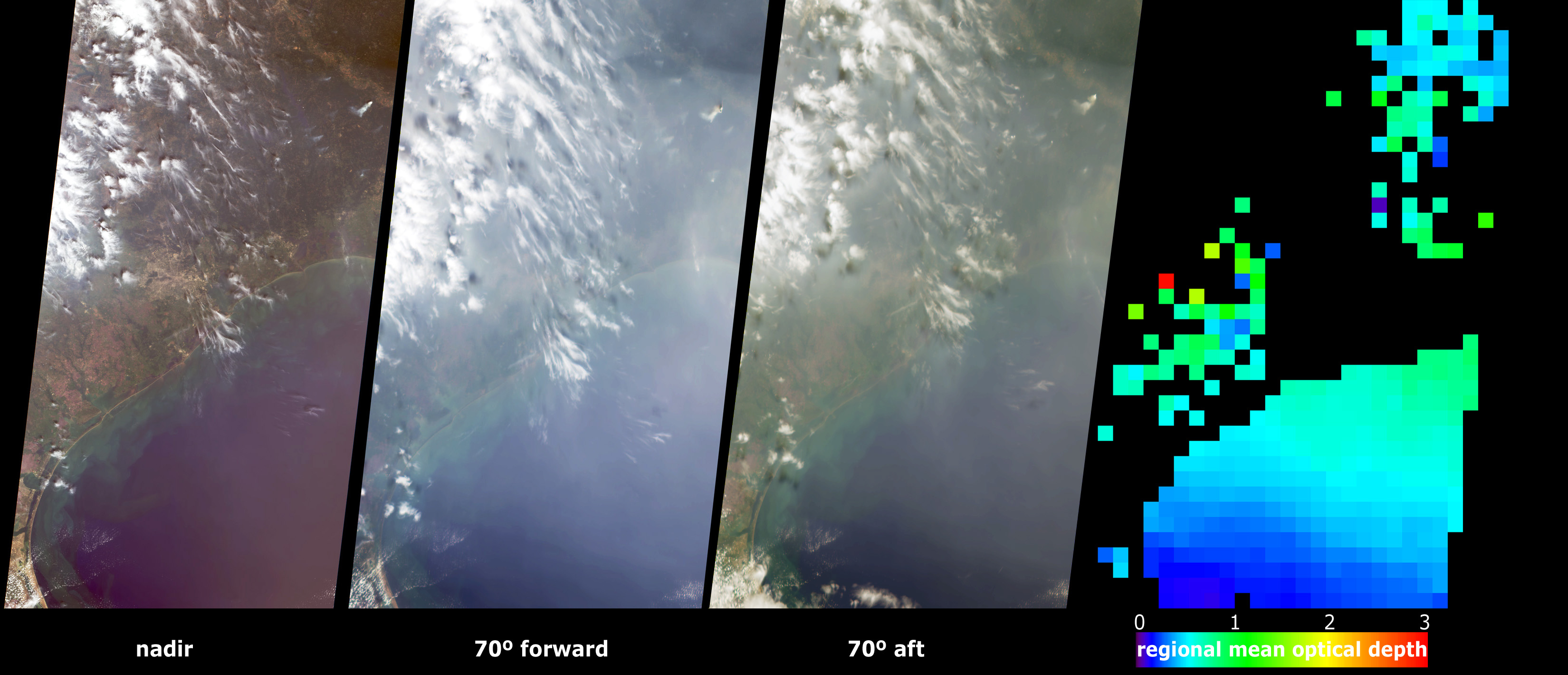 The left-hand panel is a natural-color view from MISR’svertical-viewing (nadir) camera. The center images cover the samegeographic area, from the perspectives of the 70-degree forward-viewingand 70-degree backward viewing cameras. The appearance of haze isenhanced in these oblique views, and the overall area appearssignificantly brighter in the oblique forward view because theatmospheric particles scatter more sunlight into the forward direction.Due to geometric parallax, clouds appear to move relative to the groundas the view angle changes.