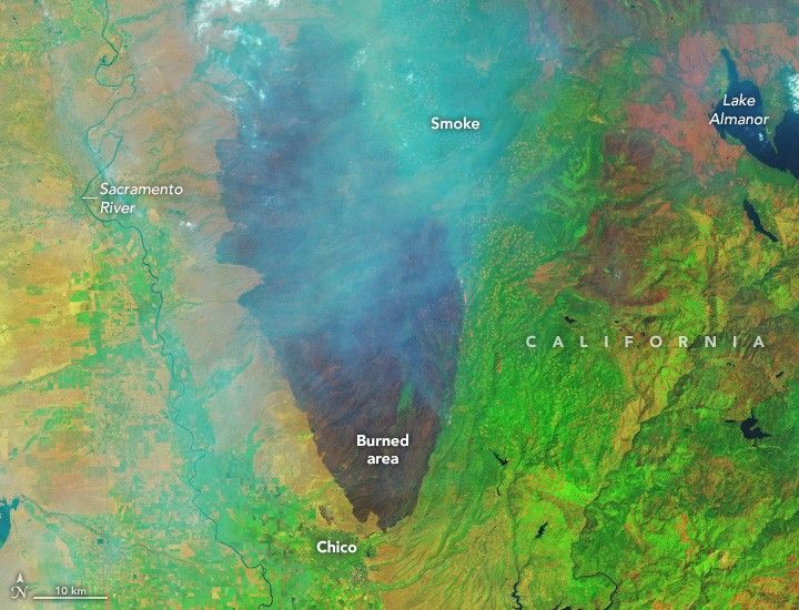 The Park Fire ignited around 3 p.m. local time on July 24 near Chico, California, and spread rapidly as it consumed dry grass and brush. By the morning of July 26, it had burned 165,000 acres. The next day, when these images were acquired, the burned area had ballooned to 307,000 acres—an area larger than the city of Los Angeles—according to Cal Fire. Record heat, high winds, and abundant dry fuel contributed to the extreme fire behavior and rapid expansion, experts told news sources.