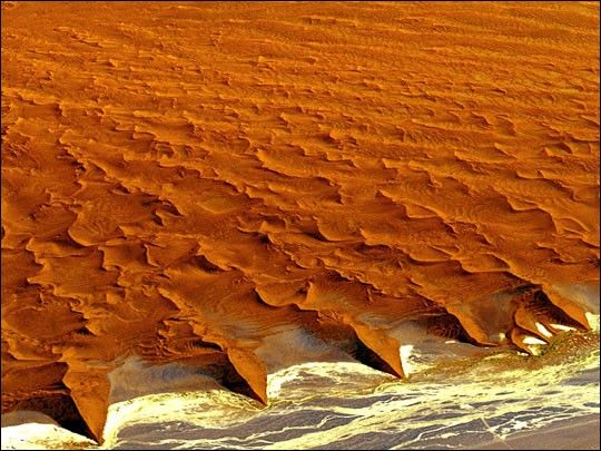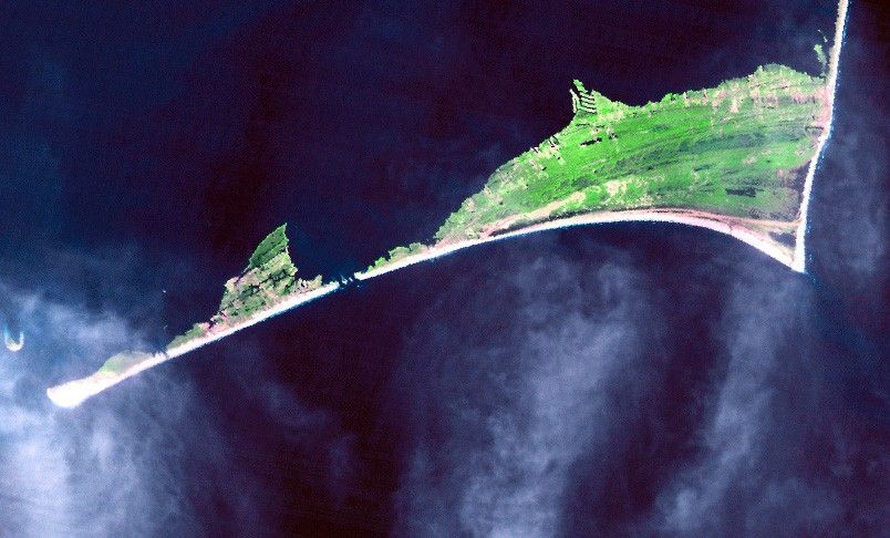 The Atlantic’s powerful waters gouged a new inlet across Hatteras Island in North Carolina’s Outer Banks on September 18, 2003, when Hurricane Isabel came ashore. The top image, taken by the Landsat 5 satellite on September 26, 2003, shows how the storm split Hatteras Island in two. The bottom image, taken on October 25, 1999, shows the southern tip of Hatteras Island before Isabel wrought her damage. The inlet cut across Highway 12 near a section of Cape Hatteras National Seashore Park, to the right of the break in the top image. The park houses the famous Cape Hatteras Lighthouse. Cape Hatteras Village to the south of the break on the green pointed section of land (left) is now isolated from the rest of the island.