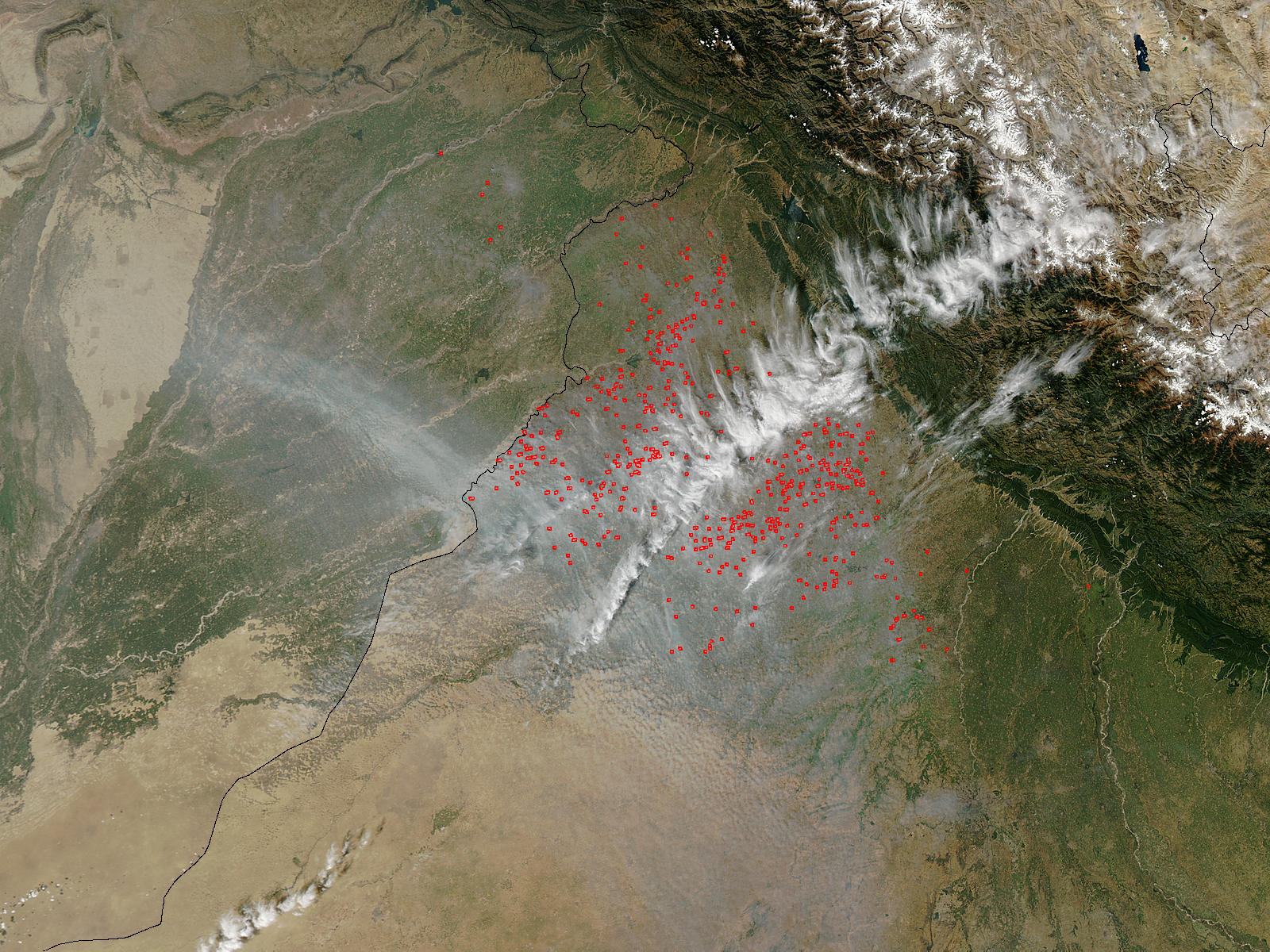 A strip of clouds cuts across fertile plains at the foothills of the Himalaya Mountains in northwest India in this Moderate Resolution Imaging Spectroradiometer (MODIS) image captured by the Aqua satellite on October 16, 2003. Across the region, MODIS detected numerous fires, which have been marked with red dots.