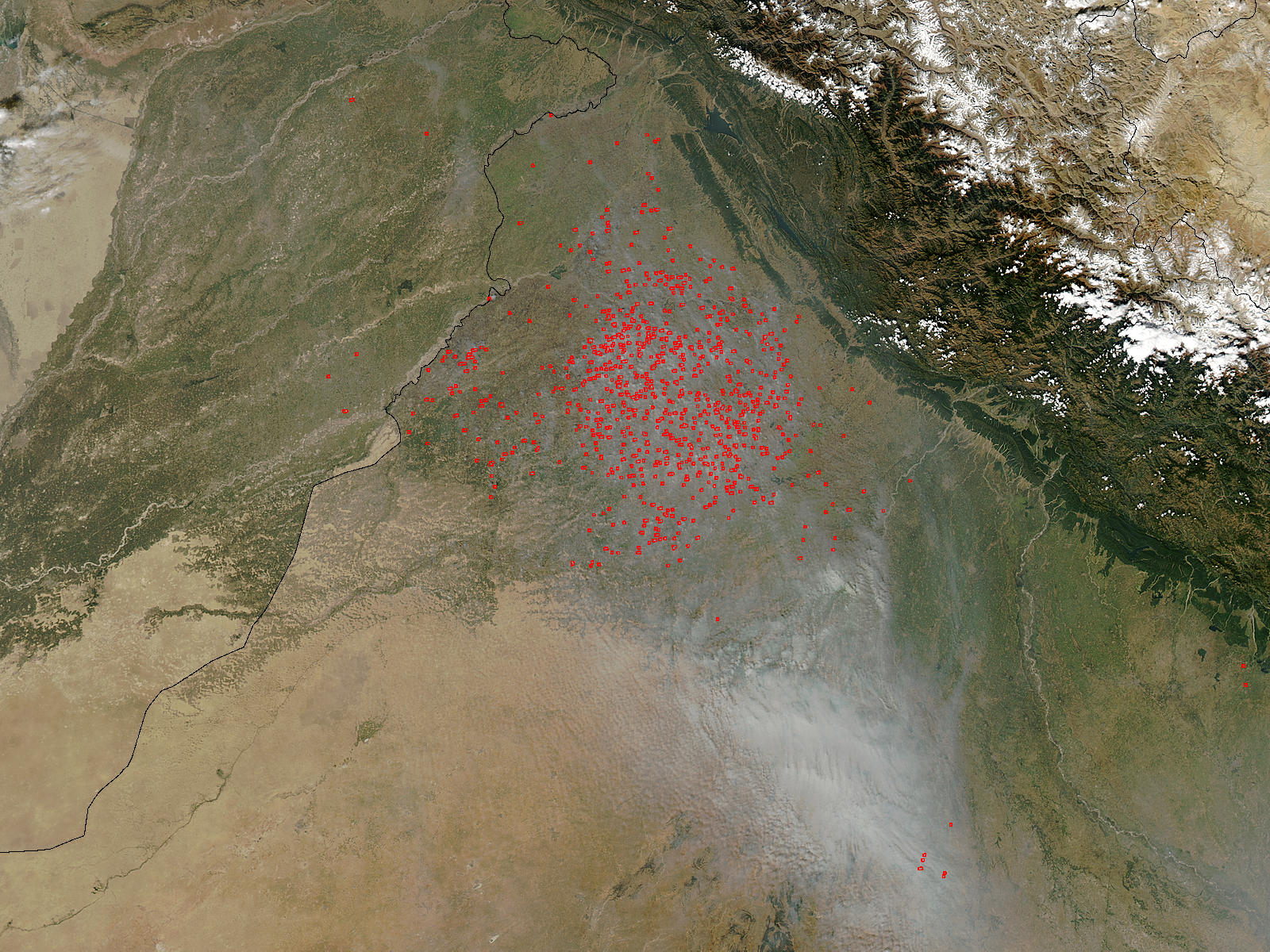 To the southeast of a dense cluster of agricultural fires (red dots), a pall of smoke hangs over northwestern India. The Moderate Resolution Imaging Spectroradiometer (MODIS) on the Aqua satellite captured this image on October 23, 2003.