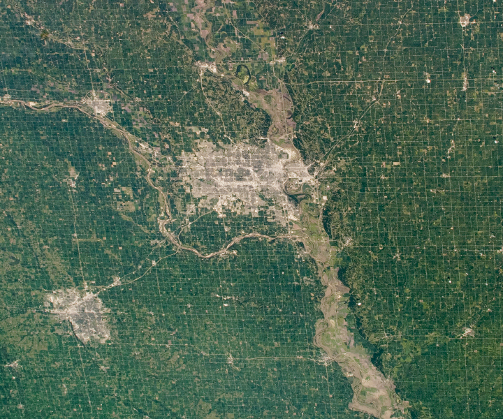 A network of farms and ranches surrounds the cities and small towns near the Nebraska–Iowa border. An astronaut onboard the International Space Station (ISS) took this photograph highlighting Nebraska’s two most populous cities: Omaha and Lincoln. The grid-like pattern that spreads across the encompassing flatlands is typical of the Great Plains region and of Nebraska in particular, where 91 percent of the total land area is covered by farms and ranches.