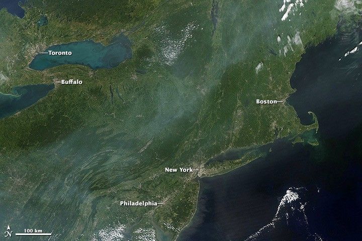 There is hope—and precedent—in today’s relatively clear skies over Europe and North America. Astronauts and satellite instruments (such as the Moderate Resolution Imaging Spectrometer (MODIS)) still occasionally see haze over the United States when pollution levels are high, but it’s rare for it to become so concentrated that the landscape below disappears. This hasn’t always been the case.