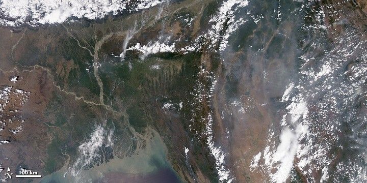 But many of the particles are the result of human activity. Coal-burning power plants, smelters, and other industrial sources can produce sulfur dioxide gas, which reacts in the atmosphere to produce light-scattering sulfate particles. Combustion engines (mostly vehicles) release nitrogen oxide, which can form nitrate particles. Diesel vehicles, wood stoves, and cook stoves emit sooty black carbon. And while aerosol particles have the biggest impact on visibility, certain gases contribute to air pollution and harm human health. Ozone and sulfur dioxide, for instance, are mostly invisible to human eyes but noxious to the lungs.