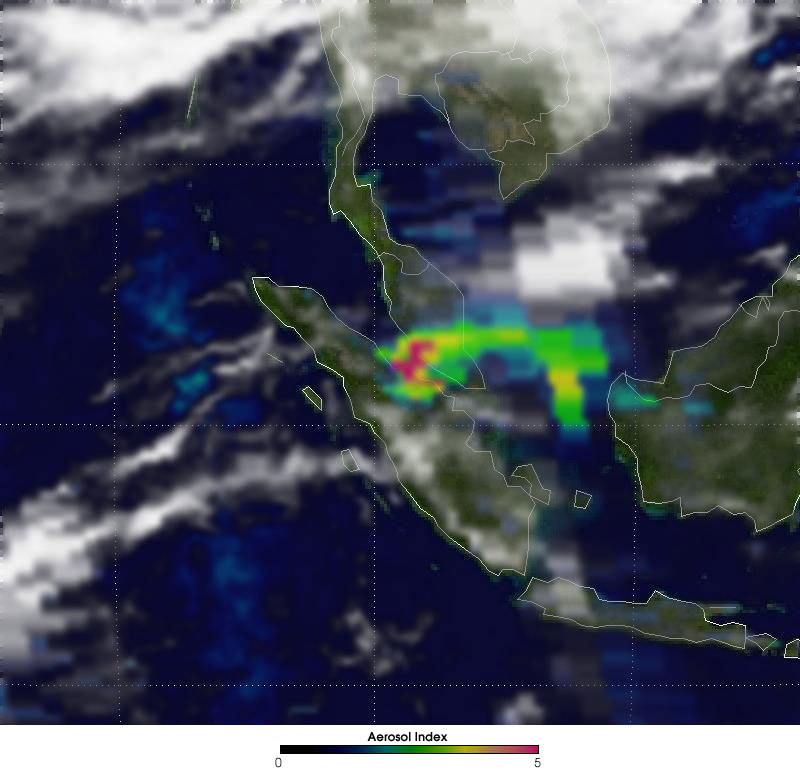 Out-of-control fires burning on the eastern shore of Sumatra (image center) created an air quality emergency for neighboring Malaysia in early August 2005 as smoke shrouded parts of the country. The smoke hung thickly over Malaysia’s busy capital, Kuala Lumpur, where it forced businesses, schools, and transportation to close. This image, created using data collected by the Ozone Monitoring Instrument (OMI) on NASA’s Aura satellite, shows the density of the smoke on August 10, 2005. Red-colored areas show where smoke was thickest.